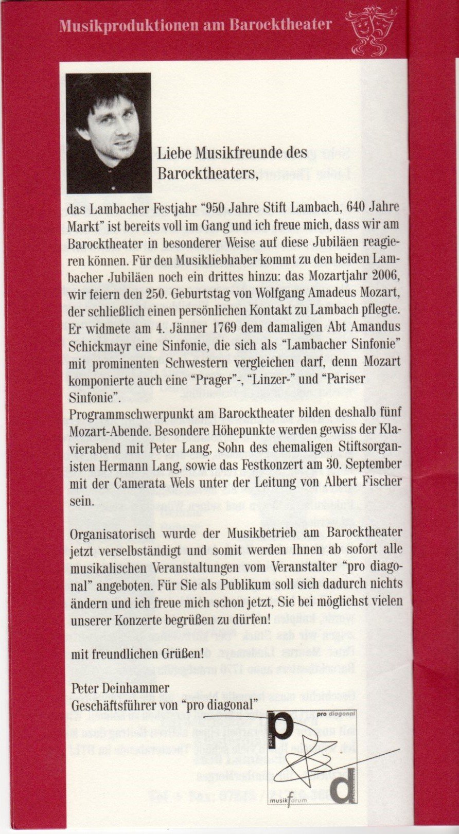 ProDiagonal wurde im Februar 2006 gegründet, und zwar als „Forum für Musik, Wissenschaft und Pädagogik“. Anlass war damals eine wirtschaftliche Trennung vom Betrieb des Barocktheaters und der im Barocktheater stattfindenden Konzertreihe, die ich dort seit 2003 organisierte. Der Name leitet sich einerseits von den Initialen des Gründers her, war aber vielmehr von Anfang an Programm: „für einen Querschnitt“, „für Interdisziplinarität“, „für kulturelle Vielfalt“, „gegen Ausschließlichkeit“ und „gegen Ausschließung“. Die erste selbständige Veranstaltungsreihe unter dem neuen Namen war eine Mozart-Konzertreihe im Jubiläumsjahr 2006, wo wir neben Mozarts 250. Geburtstag auch 950 Jahre Stift Lambach und 640 Jahre Markterhebung gefeiert haben. Damals gab es noch einen gemeinsamen Spielplan mit dem Barocktheater, wo im Vorwort auch erstmals auf die Gründung von ProDiagonal hingewiesen wurde. (gescanntes Originalheft s.u.)