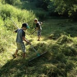 Mähen mit der Sense macht glücklich, pflegt die Landschaft, macht schlank und ist leise. Schafft Kommunikation ohne Worte und gefällt dem Nachbarn. Nicht nur, weil der Benzinrasenmäher unangestartet im Stall geblieben ist und er sich deshalb nicht über das hysterische Ansaug- Verdichtungs- Arbeits- und Auspuffgejaule des Zweitakt-Murls aufregen muss, sondern weil er einfach den schönen Anblick einer handgemähten Wiese genießt. Weder genervt, noch neidisch - nur dankbar ist er. Und glücklich. Und ganz ohne Worte! Und: kost´ fast nix.